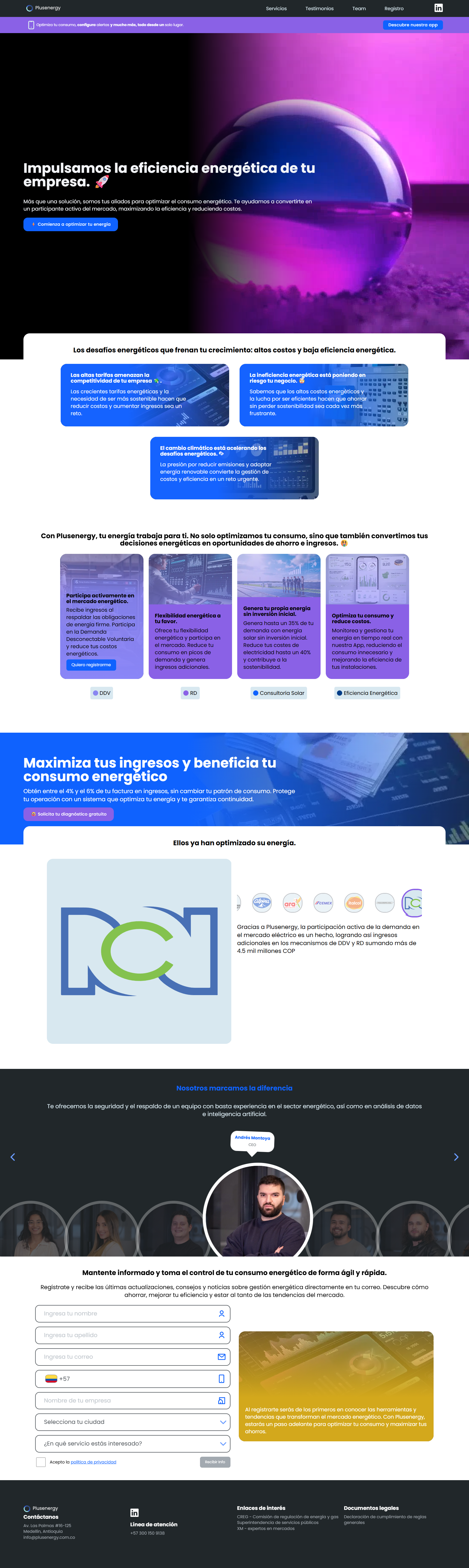 Sitio web corporativo y plataforma de monitoreo para empresa del sector energético, con integración de apps móviles (disponibles en App Store y Google Play).